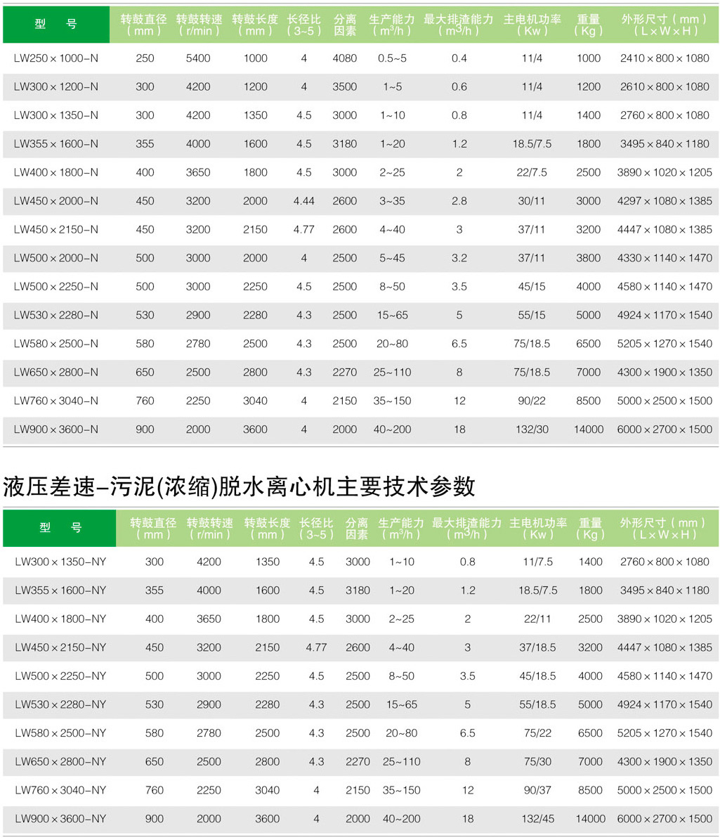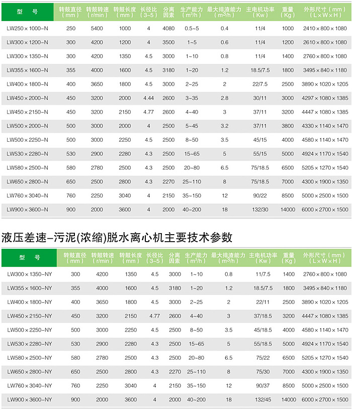 機械差速-污泥(濃縮)脫水離心機主要技術參數